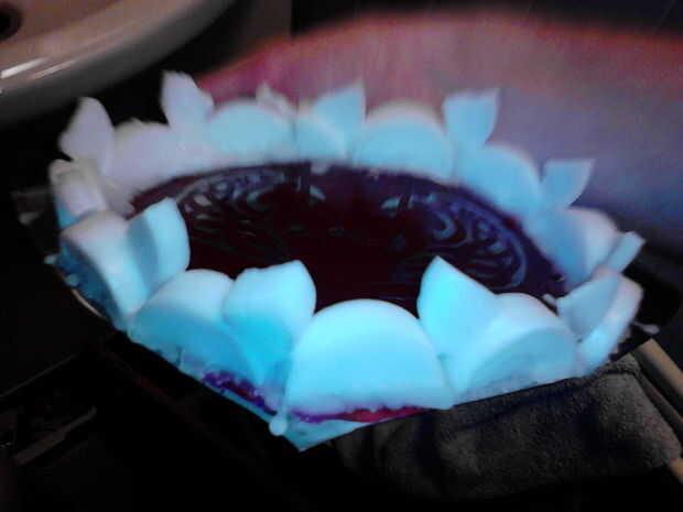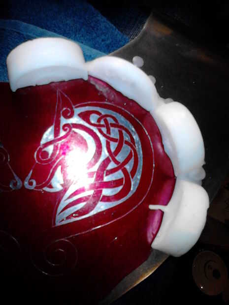 Empezar por un poco de fusión el lado plano de la vela reducir a la mitad y pégalos alrededor de su diseño, asegúrese de que las velas no son sobre el borde del esmalte alrededor de su diseño por lo que es metal (excepto el diseño tallado) expuesto dentro de vela presa.