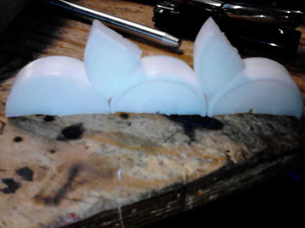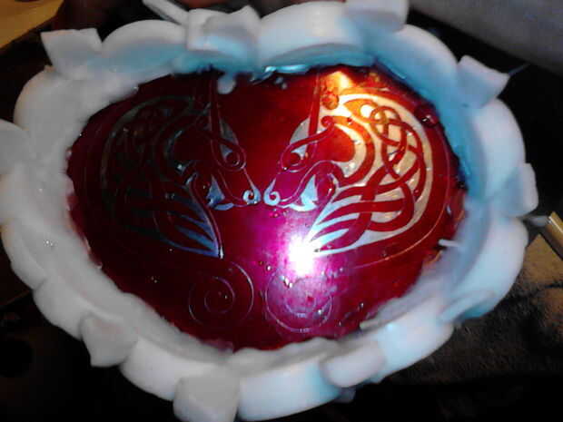 A continuación coloque las velas del cuarto en los boquetes entre las mitades y asegurar con más cera fundida. Mantenga este va hasta tienes una presa de todo su diseño. Asegúrese de que no quedan huecos y ningún metal expuesto es no parte del diseño, utilizar poco más de cera si es necesario.