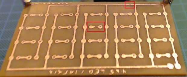 Una vez que has quitado el papel, usted puede notar que usted tiene algunos boquetes o agujeros en su traslado. Bueno, eso sucede. Lo que debemos hacer para recuperarse de esta situación es llenar los huecos con un lápiz que utiliza una tinta resistente a etch. Si usted va en línea y búsqueda para etch a prueba de plumas... esperar a pagar mucho. Si no eres tan rico como Creso, luego ir a la papelería o tienda de arte y comprar un marcador Staedtler Lumocolor permanente. ¿Vienen en una gama de gruesos de (lo que he visto, esto no es una lista definitiva) medio M a F multa... hay un S pequeño? allí también... pero realmente no he miró de su punta. Tengo una media punta, y me hace bastante bien y sólo me costó $4,05 AUD de la tienda arte (arteria, en Hobart). Probé con un lápiz del Chinagraph así, para la comparación y encontré que, mientras que pone un material resistente de etch, la línea es incompleta y me deja un rastro buscando picadas y rayados. Supongo que es debido a la forma que el lápiz sobre una superficie dura. También probé algunos garabatos a mano alzada con el marcador, y funcionó solo dandy. Por supuesto, Staedtler no es el único fabricante que hace un marcador de tinta permanente con etch propiedades resistentes, pero eso es lo que he intentado y logrado con.
