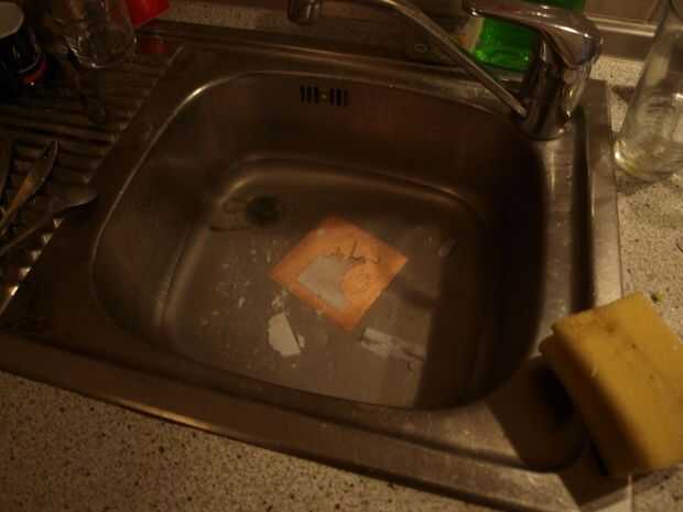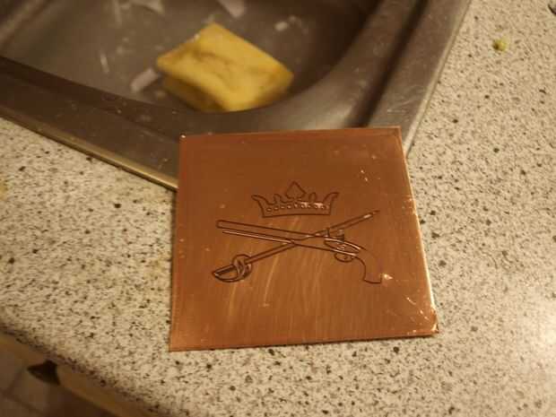 Cuando la hoja se pega en la placa, poner en agua caliente durante unos minutos, hasta que el papel salga solo. Después de un poco de frotamiento suave, el papel debe venir de completamente y sigue siendo sólo el toner.