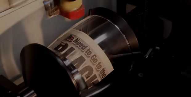 Después de configurar el archivo de lo que te gustaría haber grabado, coloque el vaso en el accesorio rotatorio usando nuestra máquina de Speedy 300 flexx. Para tener un efecto "helado" en el cristal, cubrió el área de grabado en periódico húmedo.