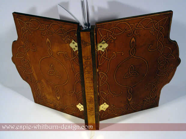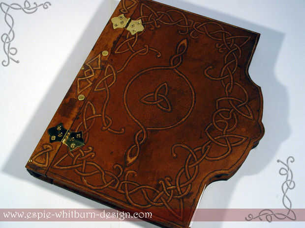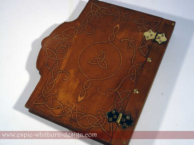 aquí es mi libro más reciente. Es mano que tallada MDF acabado con pintura y aceite. Toda obra de metal es de latón macizo. Se basa en lazos célticos que diseñé dentro de AutoCAD, luego imprimir el diseño en mi impresora de A3.