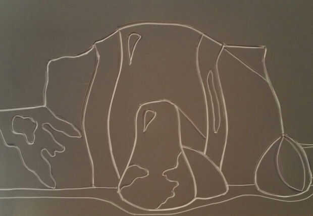 • Una vez que ha dibujado el diseño, la transferencia en el bloque de linóleo. Aquí es donde trazo y papeles de traspaso mano. Asegúrese de incluir el contorno de cada sección de color diferente, como se muestra en el ejemplo anterior.