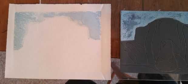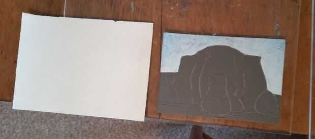 Una vez que haya terminado de pintura en el primer color, poner el papel encima y frotar a mano para transferir la tinta. Luego levante el papel y coloque hacia abajo al lado del bloque. La bisagra de la cinta que ha creado mantendrá el papel de moverse durante las múltiples impresiones. A diferencia de los otros color relieve métodos de impresión, es más fácil crear cada impresión línea blanca todos a la vez, en lugar de imprimir un una color edición entera a la vez, puesto que ya has grabado por su papel.