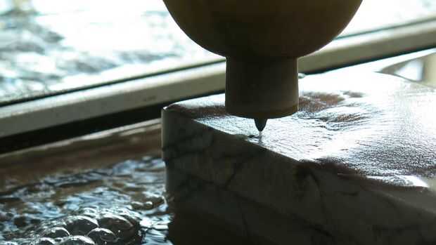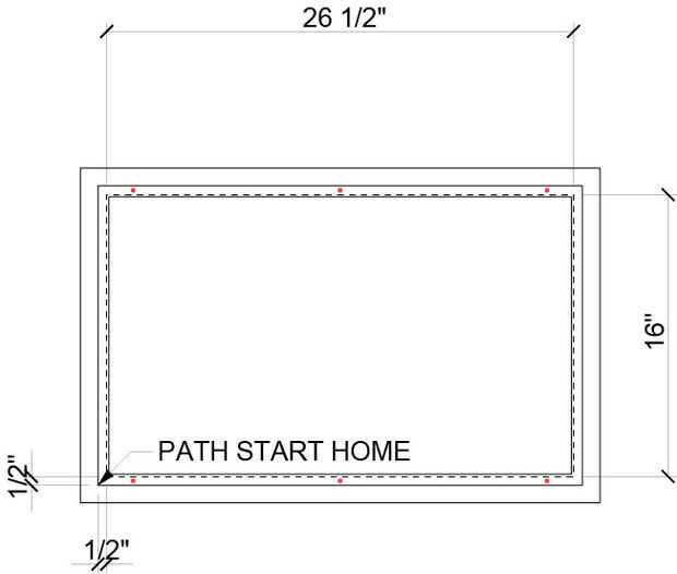 Para continuar acentuando características como el texturizado y la subvaloración de la superficie, quería tener el ventilador de socavas hacia fuera desde el centro del panel. Para hacer esto, yo cumplire para comenzar la operación de grabado en el centro, grabado al final de un lado, girar la pieza 180 grados y realizar la misma operación. Para hacer esta rotación tan preciso como sea posible, colocó la pieza utilizando seis clavijas (representadas por los puntos rojos en el dibujo arriba) en una pieza sacrificial de contrachapado que estaba sentado debajo de la piedra durante el proceso de grabado.