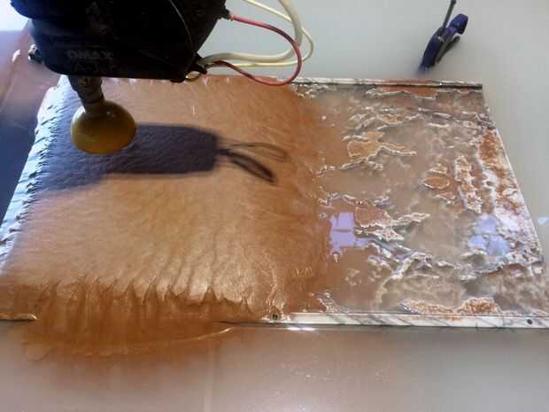 Con la primera operación de grabado completada, me bajó el nivel del agua y empecé a bancos / girando la pieza. Yo también había acumulado una gran pila de granate a contender con. Después de enjuagar el exceso granate con una manguera, pude levantar la pieza de las clavijas de su registro. Como algunas de las clavijas fueron pegados, tuve que conseguir otra clavija suelta y los golpee con un mazo. Finalmente, fui capaz de girar la pieza 180 grados y alineados con los agujeros de registro. A continuación, vuelva a insertar mi clavijas y estaba listo para comenzar el segundo paso de la aguafuerte.