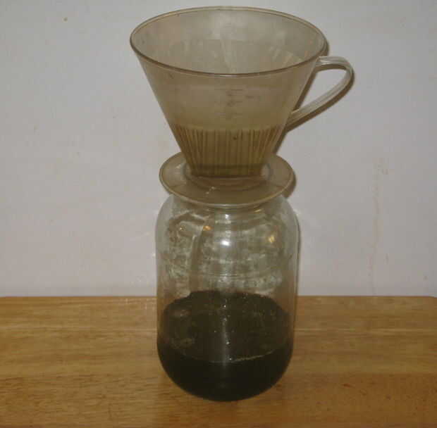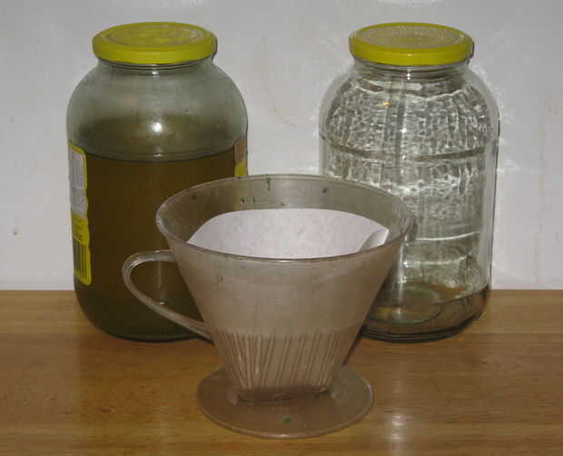 Utilizando el filtro de café, filtrar cualquier sólidos en el jugo de la salmuera como transferencia el jugo de un recipiente a otro.