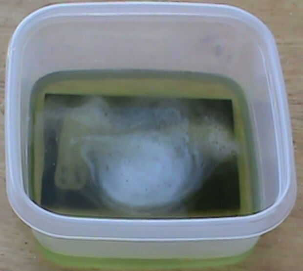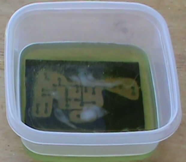 Cuando era que nada iba a suceder me vertió el grabador en el recipiente desechable y coloca el tablero del PWB en blanco en el grabador. En primera nada sucedió y después de esperar un tiempo añadí un poco de sal. Casi de inmediato comenzado a burbujear el tablero del PWB, he añadido algunos más sal y realmente podía ver el grabador comienza a trabajar en el tablero del PWB.