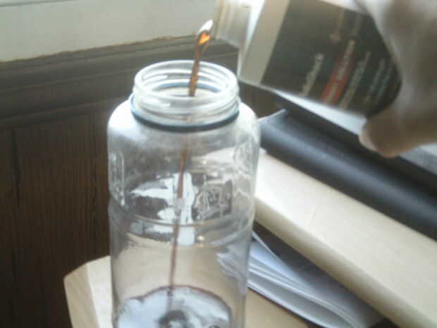 Llenar su contenedor de grabado con el grabador, en mi caso vierte la totalidad 16 oz botella de cloruro férrico en mi tarro de maní. Lo hago por varias razones. 1. es más fácil de asegurarse de que hay un montón de fresca grabador para la Junta. 2. la jarra que contiene 16oz de grabador es solo la mitad completa y con la forma de la parte superior cuando remolino el grabador alrededor allí es menos ocasión de derramar cualquier grabador hacia fuera. 3. que es lo que tengo: P.