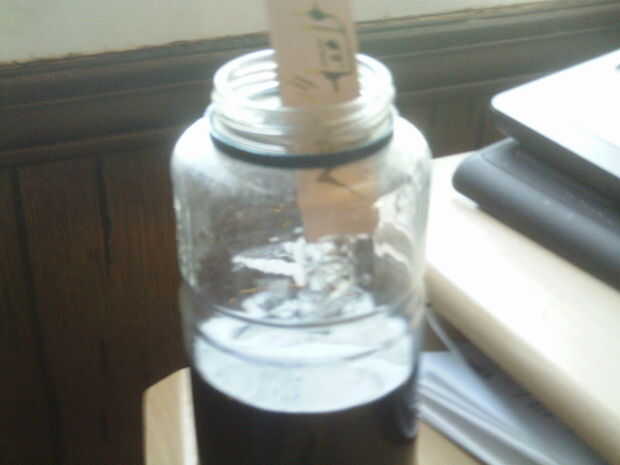 Después de llenar su contenedor grabado cuidadosamente deje caer su listo para ser grabado al agua fuerte tablero en. Dependiendo de la temperatura y la frescura de tu grabador esta podría tomar desde 10 a 40 minutos. Trato de remolino de vez en cuando el grabador por mi tablero. Esto es donde realmente aprecio mi cacahuete tarro, la forma de la jarra y volumen que me permite agitar el grabador con no toques si no voy loco con la manera en remolino.