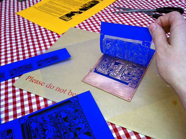La forma en que funciona es grabado en el lado azul con una impresora láser, luego Dale la vuelta y hierro sobre el cobre. El toner nuevo se derrite y se pega al cobre (igual como papel brillante) pero como la capa azul tiene mala adherencia a la hoja viene despegarse como usted pela lo apagado dejando el residuo sólo donde el toner fue.