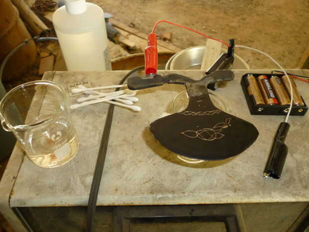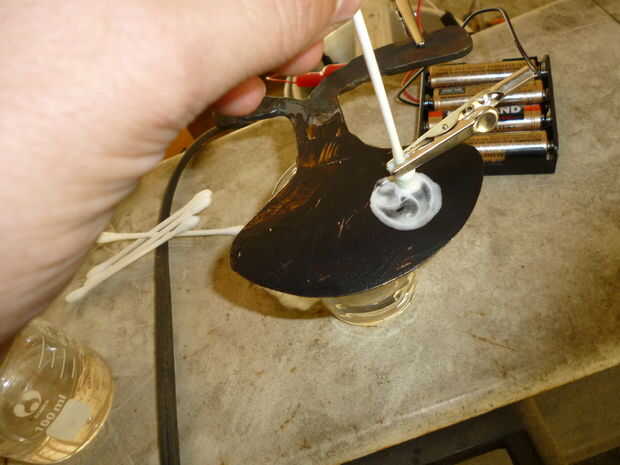El terminal positivo se une a la lámina y el terminal negativo se conecte al (en mi caso) un q-Tip que ha sido sumergido en ácido. Todo lo que hacemos entonces es frotar el hisopo alrededor del diseño hasta alcanza la profundidad deseada de etch.