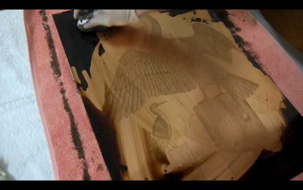 Una vez que la placa ha sido sumergida en la solución de la aguafuerte para una cantidad adecuada de tiempo la tierra se puede quitar. El suelo es removido con aguarrás y un paño de algodón suave. Teniendo cuidado de no rayar la placa, debe eliminarse todo el terreno y la superficie debe ser pulida limpio antes de proceder a la etapa de impresión.