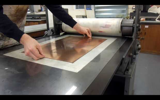 Aguafuertes y grabados de la Calcografía tienen que imprimirse en una prensa de grabado. Prensas de grabado vienen en varios tamaños; la prensa utilizada para imprimir esta imagen es una gran máquina 'Enjay'.