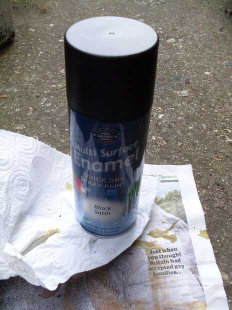Tiempo para acabarlo! Una vez más, limpio y seco es el nombre del juego aquí. Hazte con tu pintura y agite para mezclar. Algunos prueba pulverizando sobre diario hasta que estés contento con tu técnica - Recuerde que la luz, pasa incluso más grande que el objeto está siendo pulverizado y delgadas capas. Una vez que estés feliz, pegar la placa de abajo y pintar! Mina rociados con tres capas finas de pintura, dejar secar entre cada capa. Recuerde rociar desde distintos ángulos para asegurarse de que captura todos los bordes de la placa al ácido. La pintura esté completamente seca antes de continuar - si eres impaciente como yo, utilizar un secador de pelo!