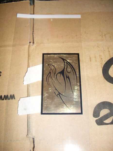 Alinee la placa con la obra de arte en la película OHP y utilizar la cinta adhesiva para pegarlo hacia abajo con cuidado. Asegúrese de que la cinta esté sólo en un lado de la placa de latón, ya que esto hará que quitar más tarde la película mucho más fácil. También asegúrese de que la cinta es tensa, como si no se mueve la obra de arte y transferimos el toner en el lugar equivocado.