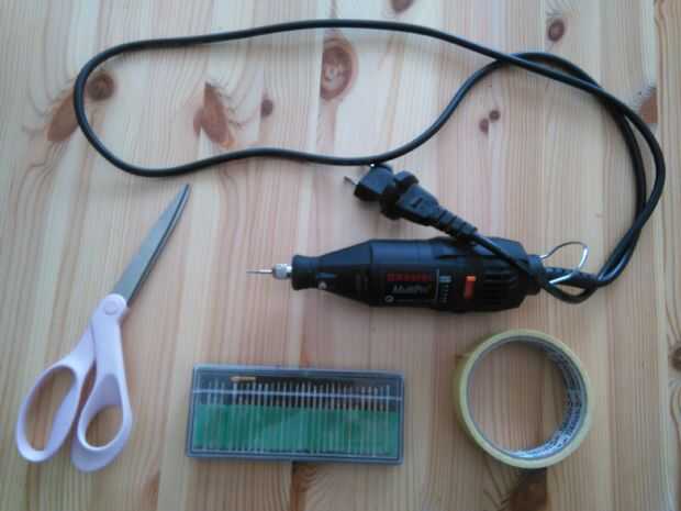 Otras cosas que usted necesita están un par de tijeras, cinta adhesiva, herramienta rotatoria y brocas con punta de diamante. Compré mi granito de arena de 5$ en ebay.
