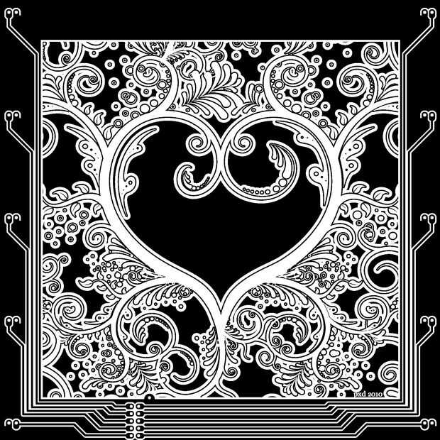 La obra de arte se encuentra dentro de una frontera, separada de la porción (externo) del circuito del tablero. Consideré la integración de los LEDs con el corazón real, pero no quería dibujar las formas para cada LED y arruinara la obra flowy. También, me gusta mucho el contraste del arte con curvas con las rectas del circuito alrededor de él.