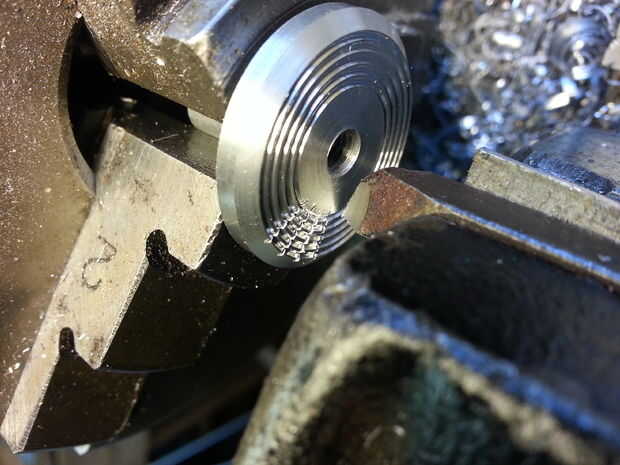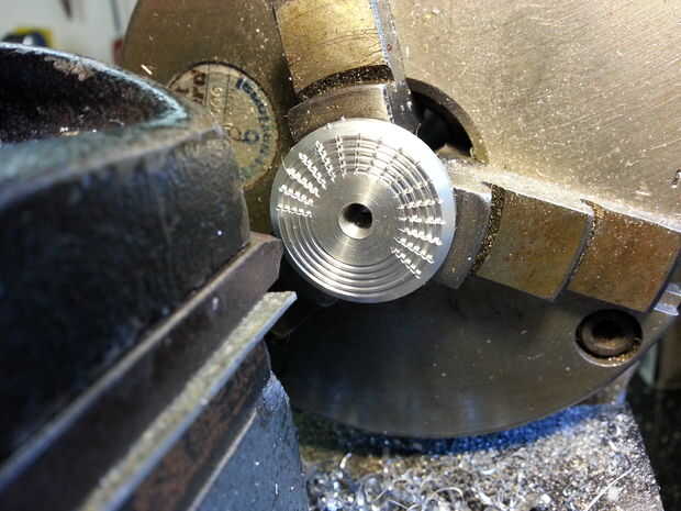 Yo no estaba muy preocupado acerca de las líneas grabadas siendo exactamente radial, por lo que no dedico mucho tiempo a establecer el punto de la herramienta de corte en la línea central del torno. Para obtener líneas radiales, esta alineación es crítica.