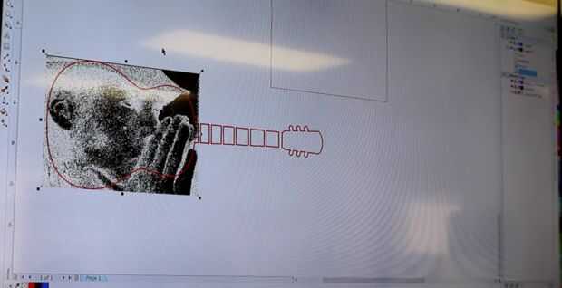 Puesto que el grabado aparecerá blanco y el cuerpo de la guitarra es oscuro, el esquema de color tuvo que ser invertida que permite grabar las áreas ahora oscuras en la imagen de la máquina.