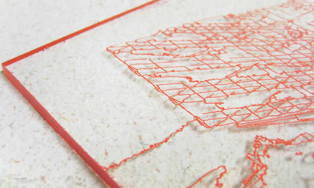 Coloque el panel de plexiglás con al menos uno de los protectores de plástico todavía en él (esto debe quedar hacia arriba). Ajuste el cortador del laser para crear un grabado de pistas que es lo suficientemente fuerte como para penetrar la película protectora y dejar un corte superficial en la superficie de plexiglás (yo usé 20 velocidad, potencia 20, 5000 frec.). Enviar los contornos para el cortador del laser y ejecutar el trabajo. Valores tienden a variar de máquina a máquina, así que por favor asegúrese de que prueba la profundidad de los cortes en un pedazo primero antes de ejecutar el trabajo final.