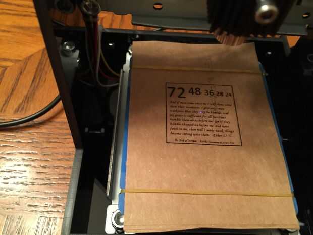 La máquina que se llama un NEJE DK - 5. Puede producir una imagen que es aproximadamente cuadrado de 38mm. La imagen de arriba le dará una idea aproximada de lo que puede hacer la máquina. Usted notará que 38 milímetros cuadrados no es muy grande, pero también aviso que incluso la letra pequeña está grabado lo suficientemente bien como para ser legible (aunque necesita una lupa para verla!)