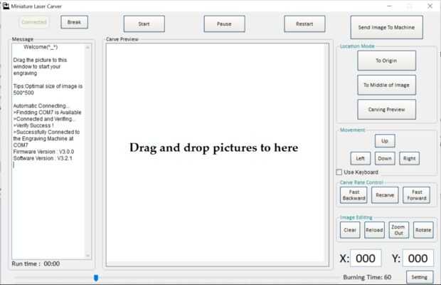 Ahora puede arrastrar y soltar la imagen en el programa grabador del Laser. Una vez allí se puede girar la imagen si es necesario. Haga clic en "Enviar imagen a máquina". Una vez que la imagen se almacena en el grabador del laser, se "dibuja" (no grabar) un rectángulo alrededor del área donde se va grabada la imagen. El rectángulo trazado sólo incluirá aquellas partes de la imagen con grabado (no está en blanco) en él.