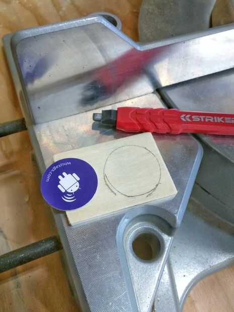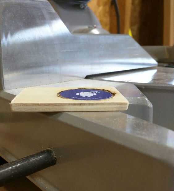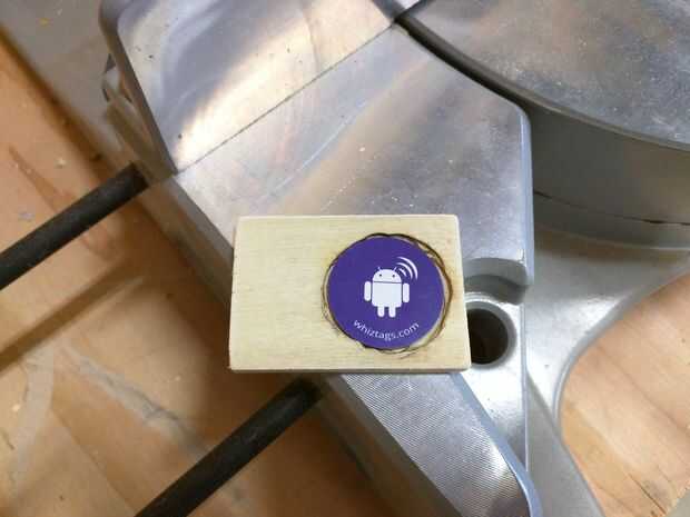 Ahora es el momento para insertar la etiqueta NFC en la tarjeta. Marcan el perímetro de la etiqueta en la parte posterior de la tarjeta en el mismo lado que lleva grabado el símbolo de la NFC. Utilicé una herramienta rotatoria con un poco de amoladora para limpiar el área, que era feo pero trabajado. Como no romper la cara o una arista y la etiqueta quede alineada en el bolsillo entonces feo son aceptable. Vamos a cubrir todo hasta más tarde de todos modos.