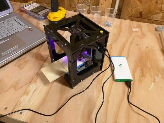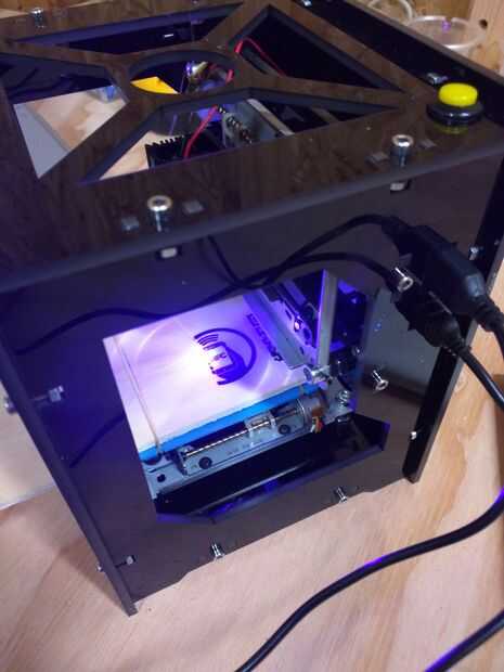 Con las imágenes listas es hora de encenderla para arriba. Orientar un espacio en blanco de madera, transmitir la imagen, sus gafas filtradas del amanecer (seguridad en primer lugar, recuerde que es un láser capaz de sublimar la madera) y deje que se queme.