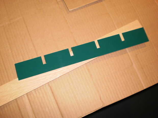 Si bien no tengo un grabador/cortador del laser, tienen acceso limitado a una en la que trabajo. Para facilitar marcar y cortar las piezas del divisor que corte el contorno en el tercer cuadro (segunda línea dibujo, parcialmente ocultado, directamente debajo de la foto principal de arriba), tamaño completo, en una pieza de plástico laserable en un Xenetech láser grabador. Este patrón de plástico se muestra en la foto número 4.