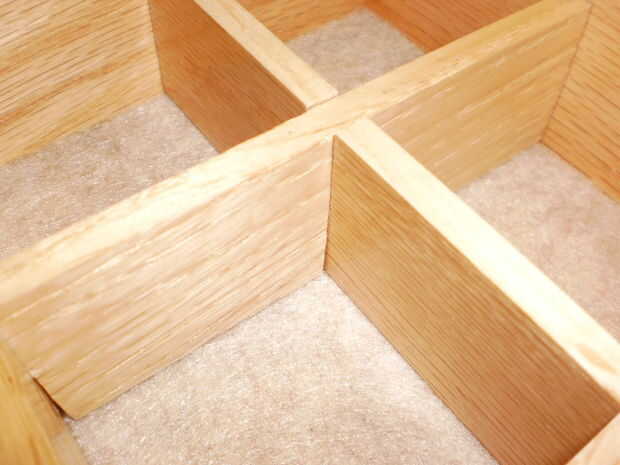Después de cortar el fieltro a los tamaños indicados, aplicar un pequeño adhesivo spray, disponible en tienda de artesanía de Michael, o Home Depot, en la parte inferior de las piezas de fieltro. Aplique cuidadosamente las piezas de fieltro a la parte inferior interior de la caja siguiendo el patrón en la primera foto. Tenga cuidado de que los bordes de las piezas de fieltro unan completamente sin superposición por lo que se ocultará bajo el borde de una pieza de separador de ambientes.