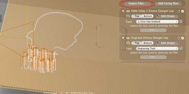 Después de que tamaño el documento correctamente para el bisel de zinc, exportamos a nuestro software de CAM, donde hemos creado algo que se llama un agujero embutido trayectoria fuera de él. Un agujero embutido es uno de muchas maneras de cortar a través de una capa de material exactamente a las especificaciones, y una trayectoria de herramienta es un término genérico para un archivo que le indica a la máquina cómo hacer el proyecto. Creamos entonces una trayectoria de herramienta de grabado de nombre de Emma, utilizando las mismas dimensiones para crear la trayectoria de herramienta de embutido de agujero. Esto hará que la línea de los archivos encima de correctamente en el Othermill.