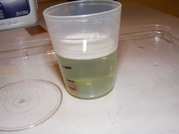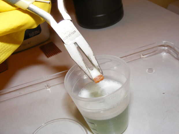 Después de una hora el cobre no desea debe hayan desaparecido, si no, espere quince minutos o así. De lo contrario, tomar sus pinzas, y saque usted está grabado PCB! Puesto y sus pinzas bajo el agua rápidamente, a menos que no te gusta alicates ordinarios.
