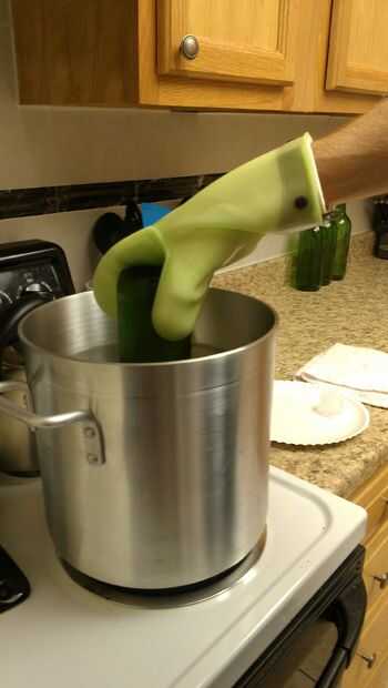 6. Colóquese los guantes. Mantenga el frasco boca abajo en el agua durante unos 30 segundos. Retire la botella y aún sosteniendo la parte inferior, coloque la tapa de la botella en la toalla. Ver foto #4