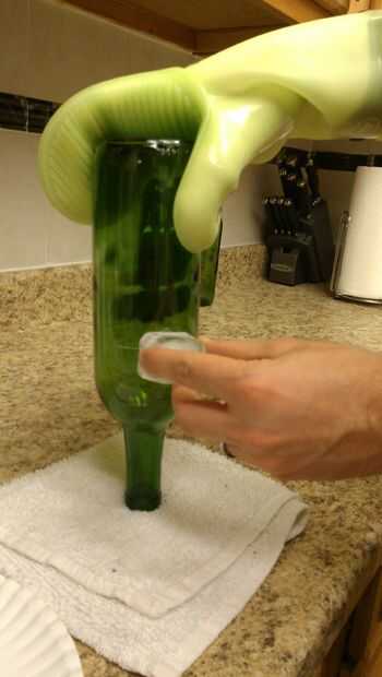 7. Sujete el cubo de hielo contra la línea y ejecutar alrededor de toda la circunferencia de la botella. Esto debe causar una grieta propagar alrededor de la botella donde está la línea. Ver foto #5