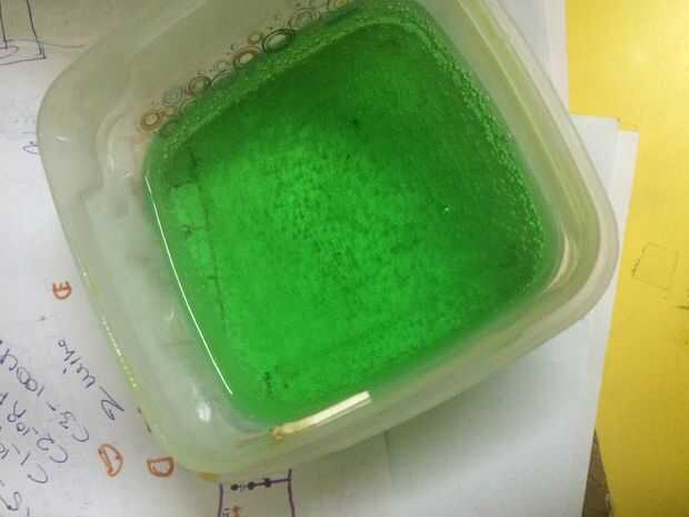 Fabricación de placas de circuito, el método más popular de eliminar el cobre alrededor de los rastros es grabado de cloruro férrico. Este proceso es lento, pero puede ser acelerado agitando y calentando la solución durante el proceso de grabado. Est