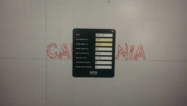 Continuación, vaya a makercam.com, desde aquí se generan la Gcode para su texto. Adelante y abrir su archivo SVG guardado, haga clic en la opción de CAM y siga Seleccione operación de trazado, como veis en la foto que tengo ajustes básicos sólo para crear la trayectoria de herramienta. Una vez que tiene que hacer, bajo clic CAM calcula todo y luego haga clic otra vez en vivo y selecciona exportar Gcode.