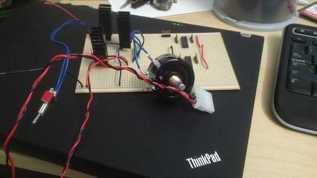 Este circuito requiere al menos una fuente de 10V y tiene un simple encendido entrada de señal, que es proporcionado por el Arduino. El chip del LM317T es un regulador de voltaje lineal, que se ha configurado como un regulador de corriente. Un potenciómetro está incluido en el circuito para permitir que la corriente regulada a ajustarse.