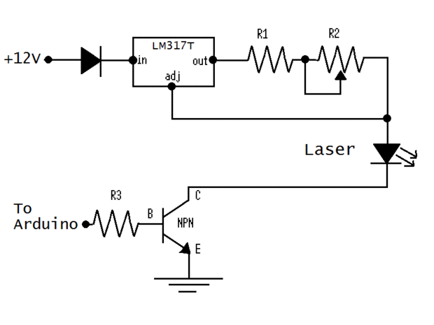 El transistor NPN se utiliza como un interruptor. Cuando hay una salida de 5V de Arduino, el circuito se enciende el láser. Cuando hay una salida de 0V de Arduino, el circuito se apaga el láser.