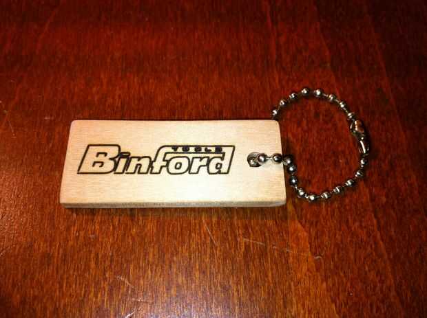 He encontrado que algunos agitador de pintura se pega en mi tienda local de bricolaje. Me ha gustado el aspecto de la madera y eran baratos. VI de una pieza y perforar un pequeño agujero. Después de un lijado había grabado el logo de Binford de la sitcom "Mejora del hogar".