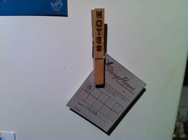 Una pinza para la ropa grabado y con un imán de neodimio pequeños pegados a la parte posterior hace una gran manera de pegar un montón de notas en la nevera o cualquier otra superficie de metal. Me gusta pinzas para la ropa son muy versátiles.