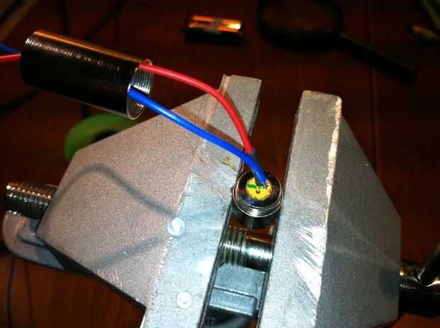 Ahora que tiene el diodo pelado es el momento de montar el diodo en la vivienda. Colocar el diodo en la carcasa y use la parte posterior de la caja para presionar el diodo muy cuidadosamente usando un tornillo de banco. Cuando esto llegue lejos estás en la recta final. Soldar los cables a lo positivo y negativo pernos, tornillo de la lente y se realizan.