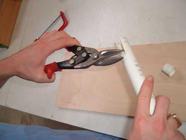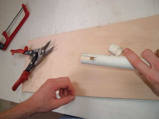 con la pieza más larga de pvc, recorte hacia fuera una ~. 25 "x 1,25" rectángulo de y al final de la tubería. La longitud del corte debe ser la longitud del tapón madera + ~. 25".