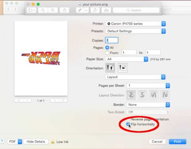En el menú de impresión en el "Diseño" elegir "Voltear horizontalmente"