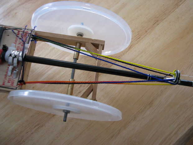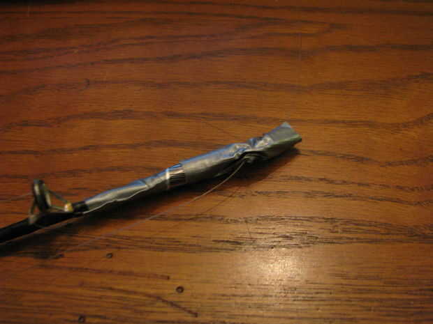 Luego tomar la línea de pesca y extienda el brazo hacia fuera y la cadena de cerca de 1-2 pulgadas más allá del eje trasero. Un nudo alrededor de la punta de la caña de pescar y luego conducto cinta adhesiva.