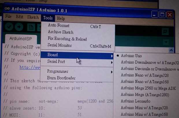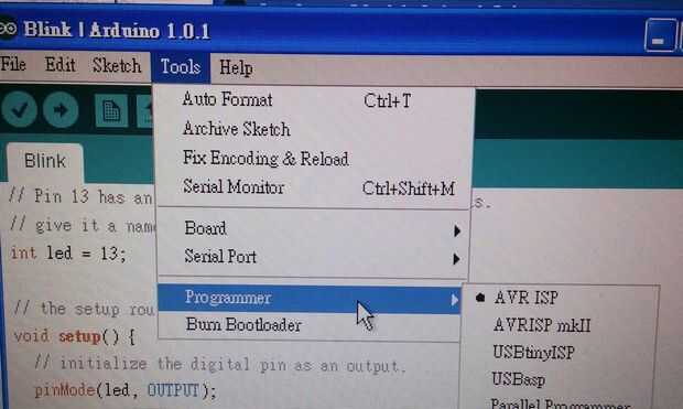 3. Seleccione Herramientas -> Programador -> AVR ISP