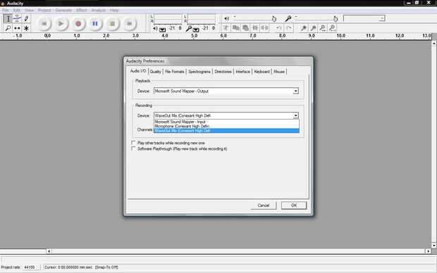 Abrir Editar > Preferencias y en el menú desplegable de "Grabación", seleccione WaveOut (Conexant High Definition). Lo sentimos, si es diferente para los usuarios OSX, no tengo Mac así que no sé.