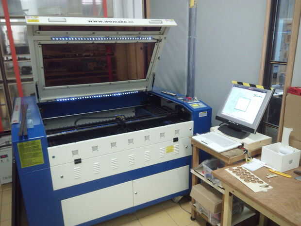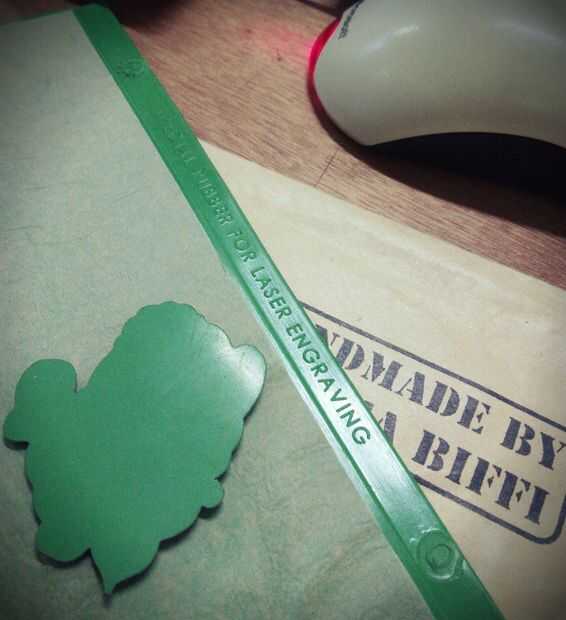 La máquina del laser que ves en la foto es la más grande de WeMake fab-laboratorio aquí en Milán, y utiliza para cortar el soporte de madera para el sello. He utilizado el cortador láser más pequeño para grabar el caucho, no necesita mucho poder, aunque con una máquina más potente llevará probablemente menos tiempo.