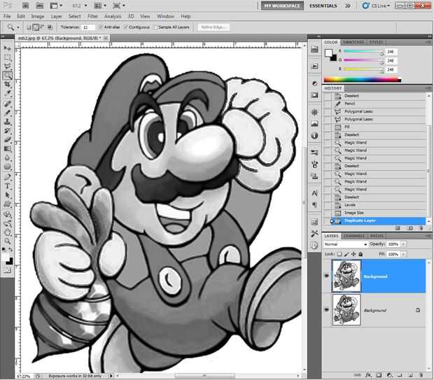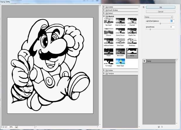 Duplicar la capa, tome la parte superior, aplique el efecto de "sello", jugar con ajustes para obtener el mejor b & w contornos imagen, luego afinar con la herramienta lápiz.