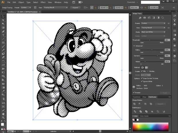 Abra un nuevo documento y arrastre la imagen raster, luego ir a ventana -> rastro de imagen y ventana de configuración de seguimiento de imagen abierta. Elegir b & w, abra configuración avanzada y jugar con ellos hasta que estés satisfecho. Sólo cambié ruido a unos 20. Prueba también "ignorar blanco" ajuste.